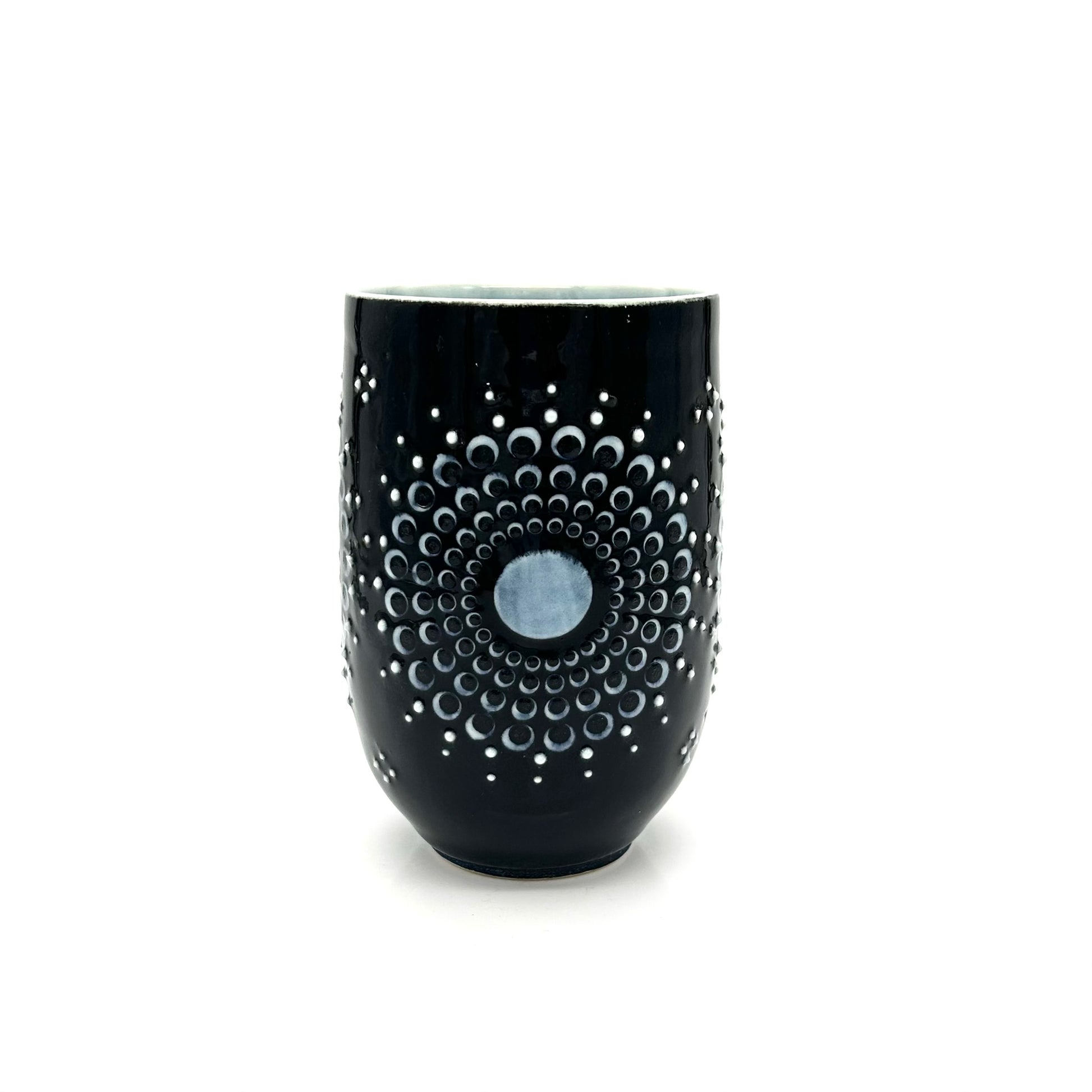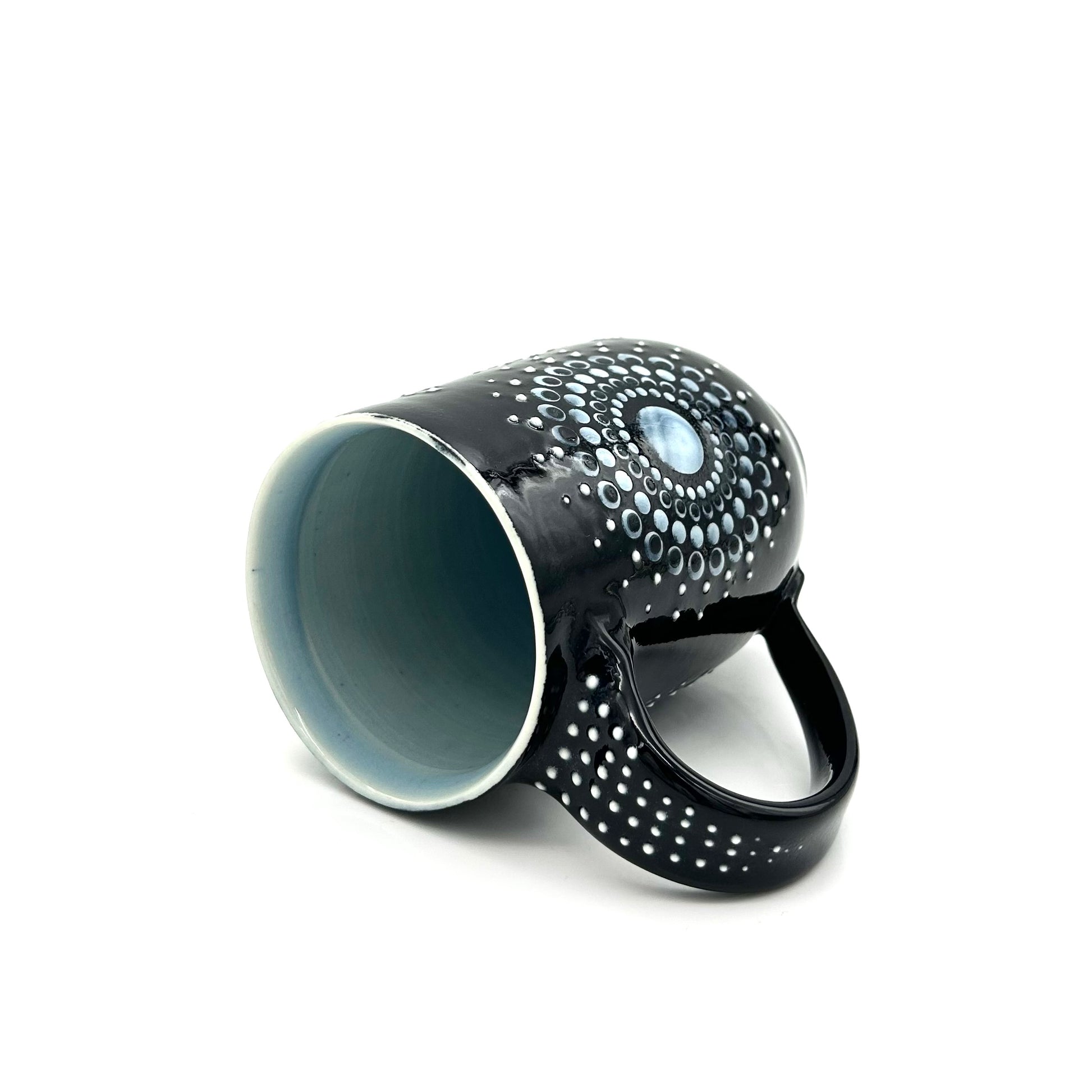 This porcelain tankard features a deep black underglaze beneath a luminous ice-blue celadon glaze. A custom ogee stencil design wraps the surface, accented with layered dots in black underglaze and white porcelain slip for added texture and visual depth.