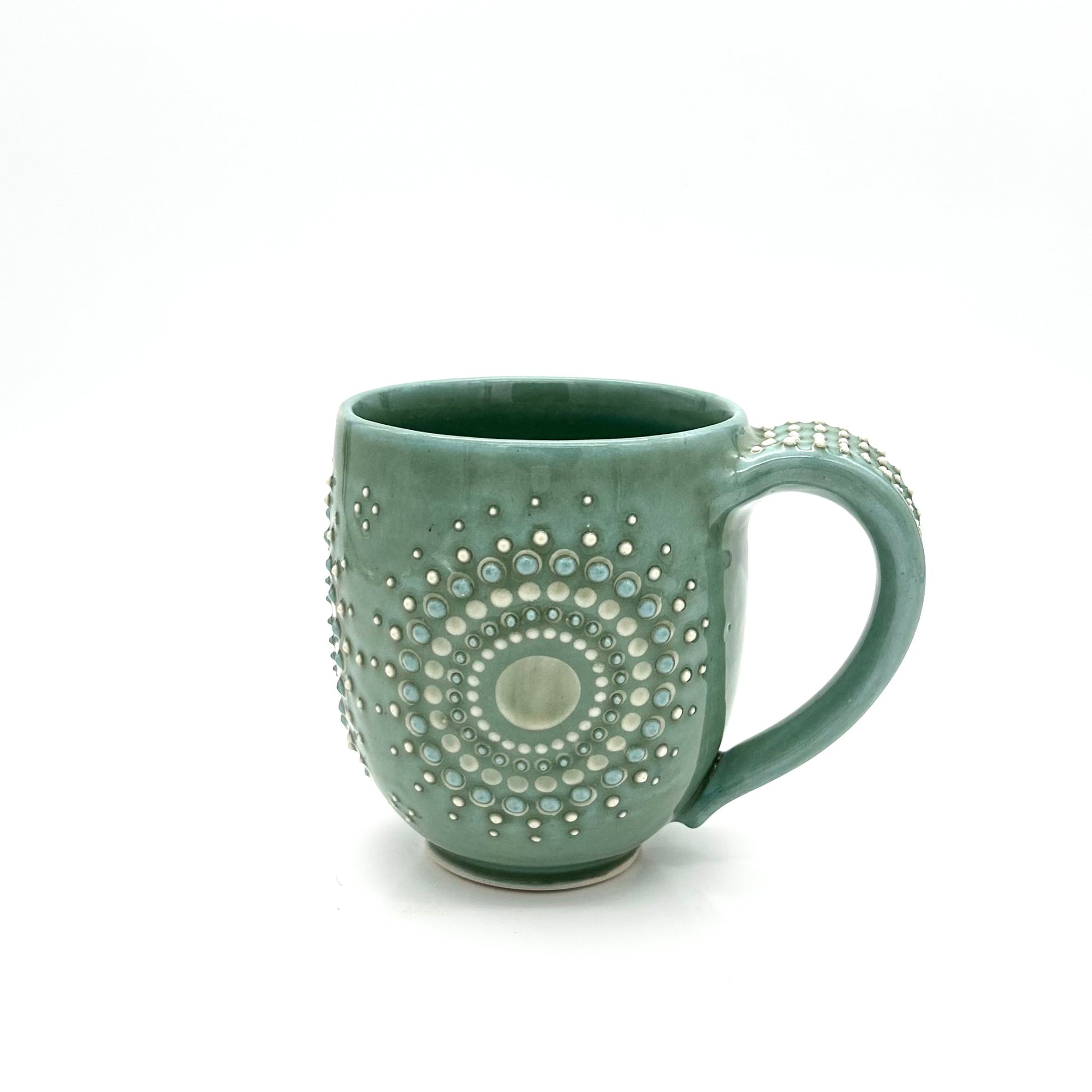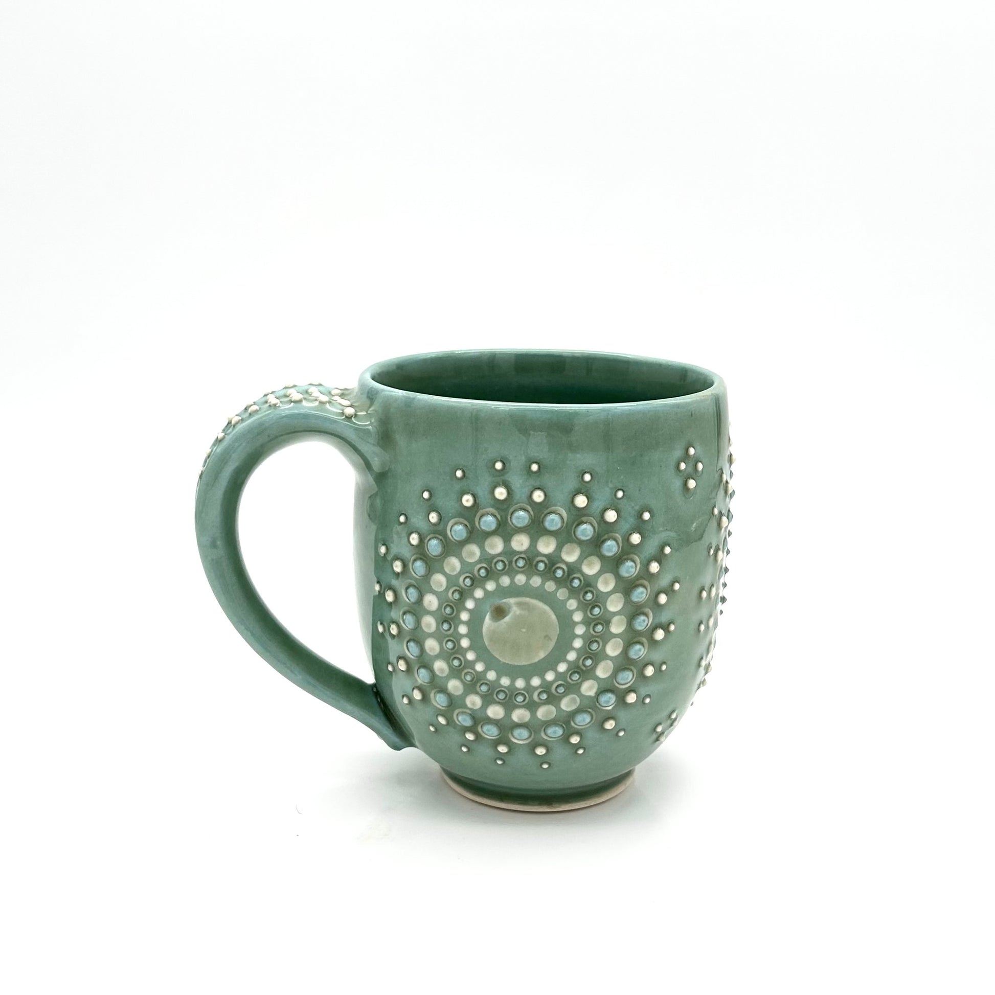 This porcelain mug features a turquoise blue slip and is finished with a Green Celadon glaze. It is decorated with a custom Mandala stencil design in white slip, accented by layered turquoise blue dots that complete the mandala pattern. The handle is topped with porcelain slip dots, creating a pleasing tactile feel under your thumb. You’ll find yourself wanting to hold and gently rub the handle as you sip your tea or coffee and reflect or contemplate your day.