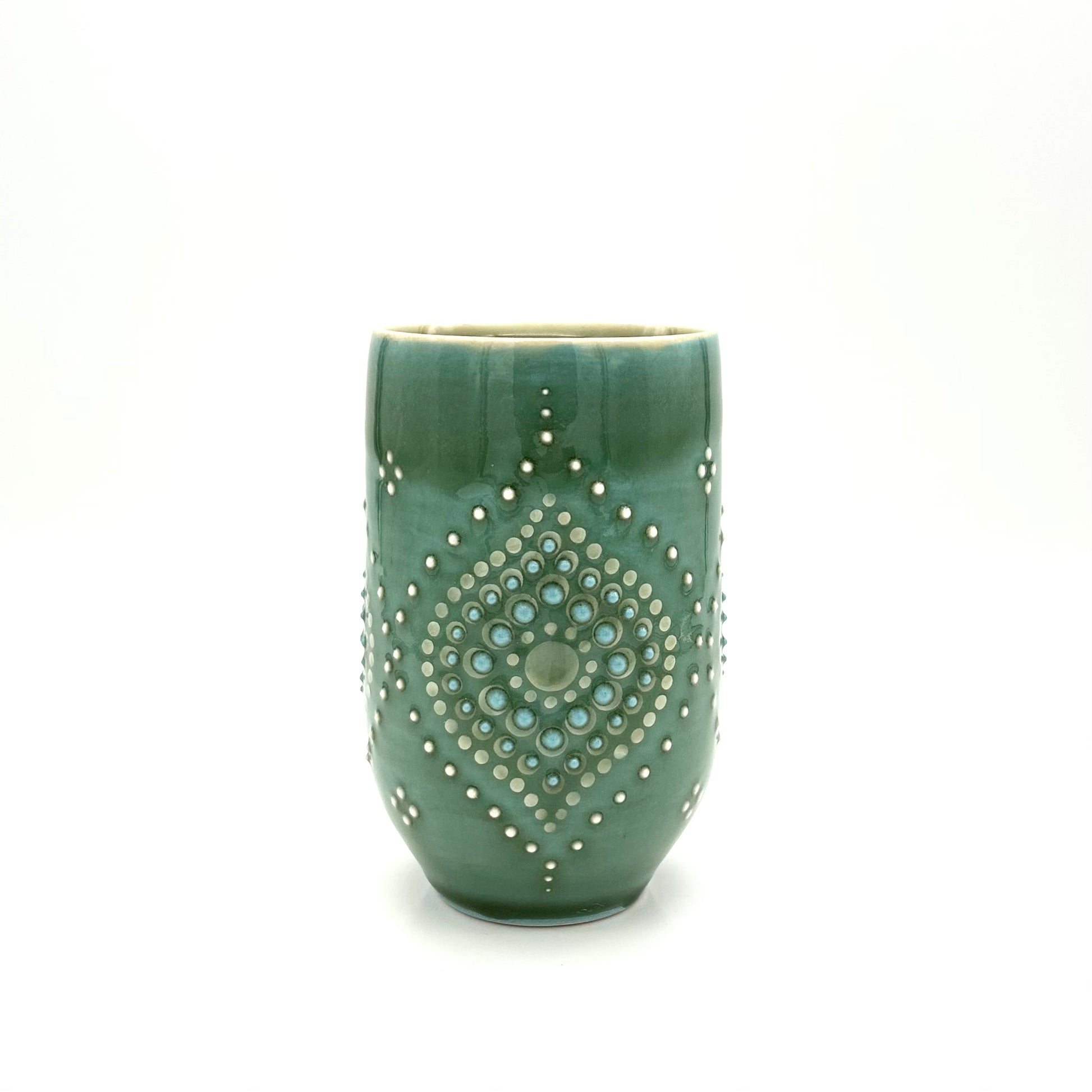 This porcelain tankard is crafted with a turquoise-blue slip and finished in a glossy green celadon glaze. A custom ogee stencil design, accented with white slip and layered turquoise dots, forms an intricate Ogee pattern that gives the piece depth and character.