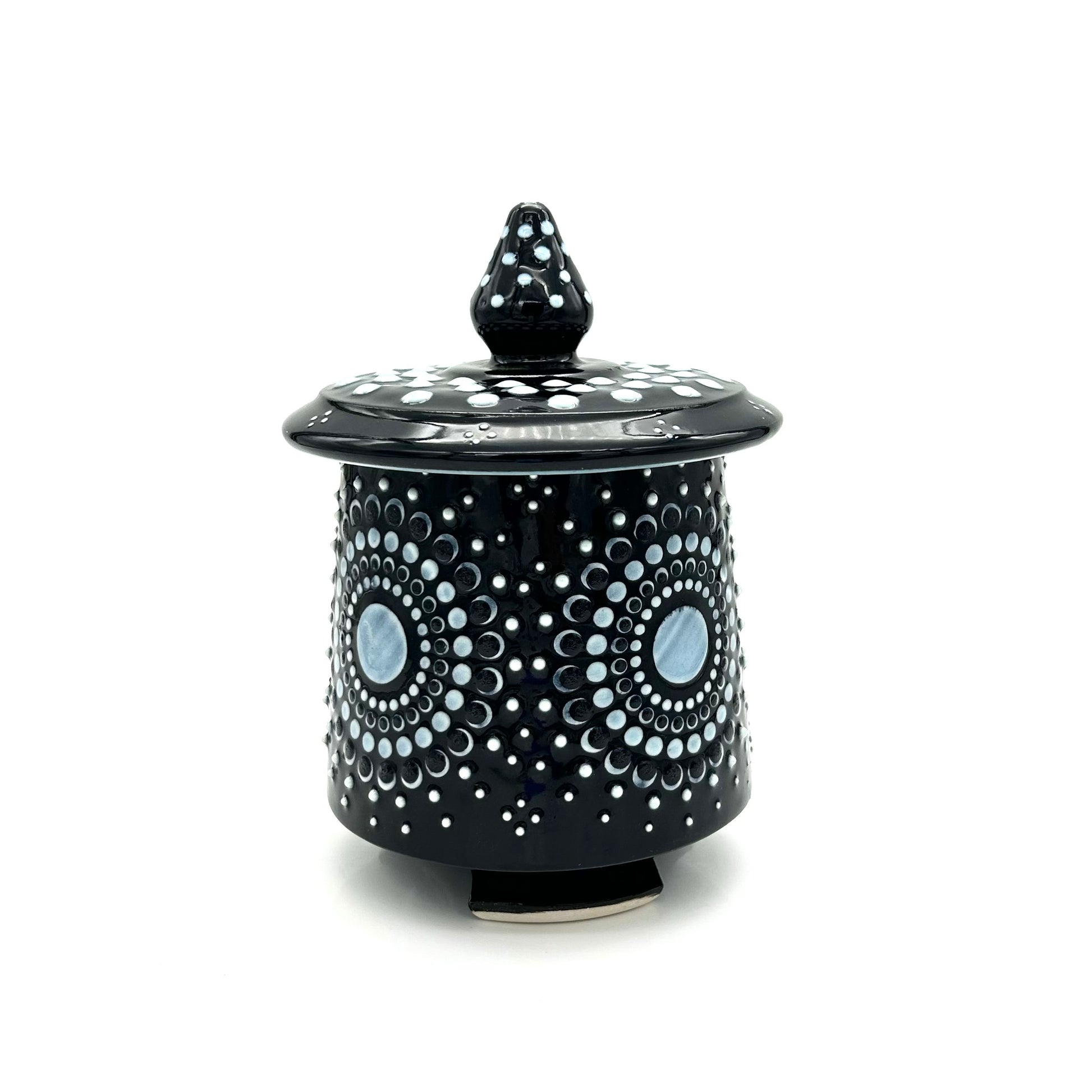 This porcelain black mandala jar is adorned with a custom mandala design with white porcelain slip and layered black underglaze dots, creating striking contrast and intricate detail. White slip dots cascade across the entire surface, adding depth and a refined tactile texture.