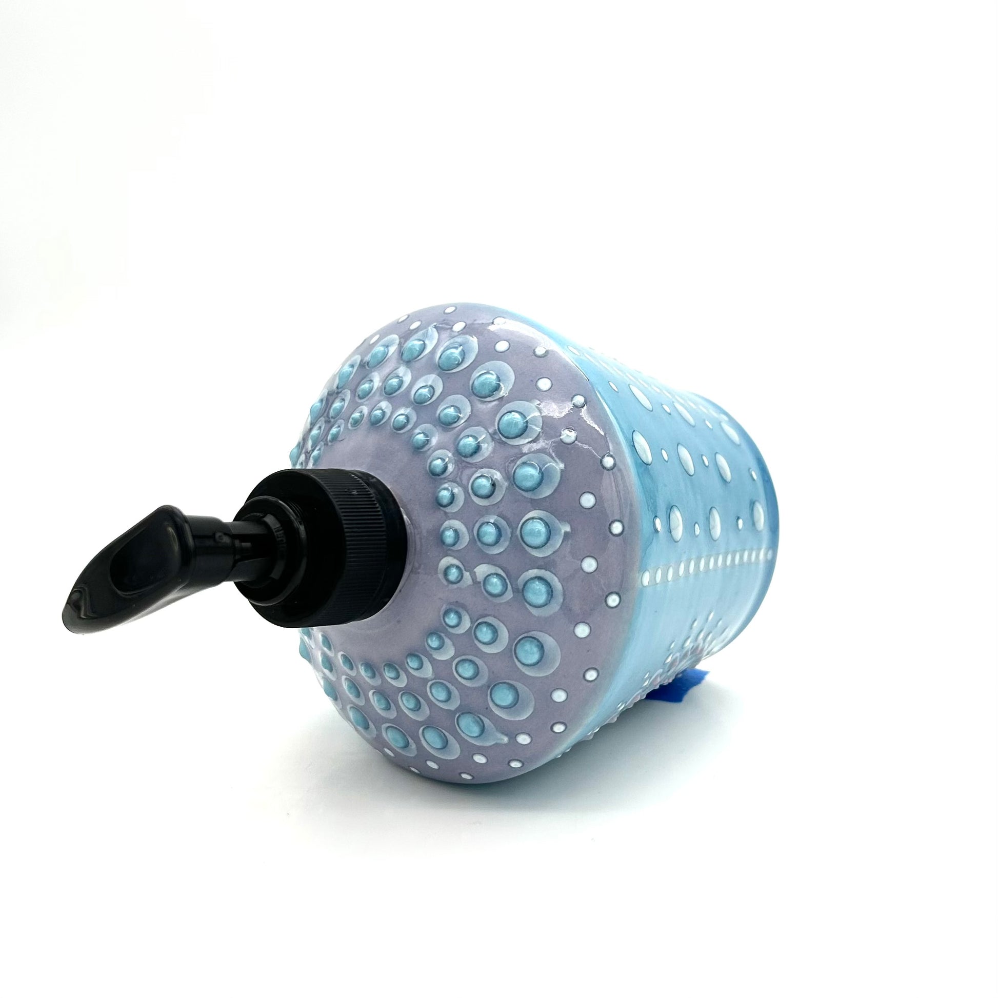 This porcelain Mandala Polka Dot soap dispenser features lavender and turquoise slip layered over a custom mandala stencil, creating a vibrant and detailed design. Glazed in ice-blue celadon, it’s further accented with hand-applied colored slip and white underglaze dots that add depth and a satisfying tactile feel.