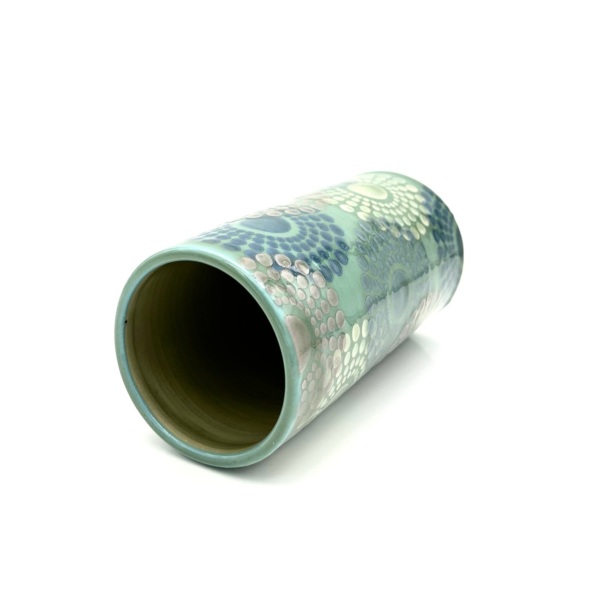 This porcelain tumbler is finished with a turquoise-blue slip and coated in a smooth green celadon glaze. Custom mandala stencils in multiple slip colors create layered, flowing patterns across the surface. Tall and comfortable to hold, it’s an excellent choice for iced tea, chilled water, or any refreshing drink.